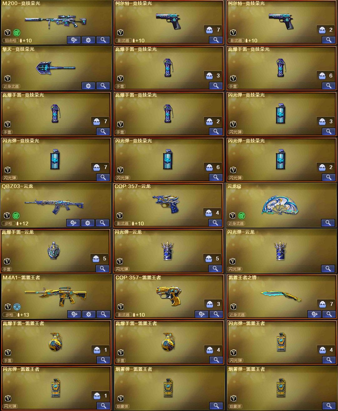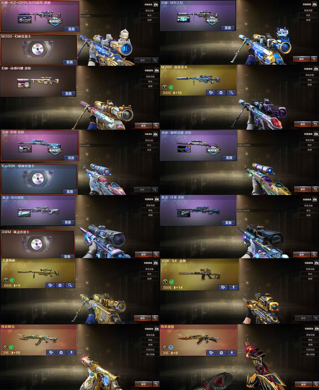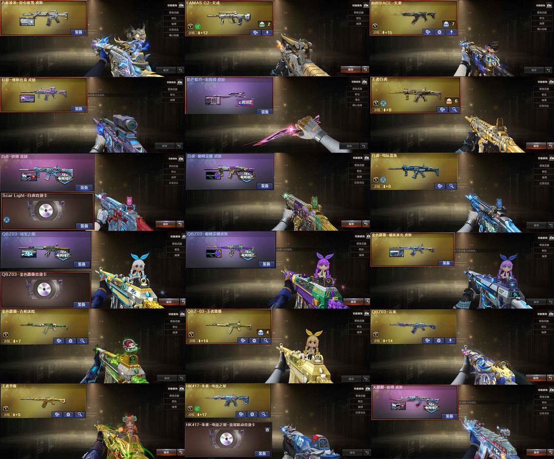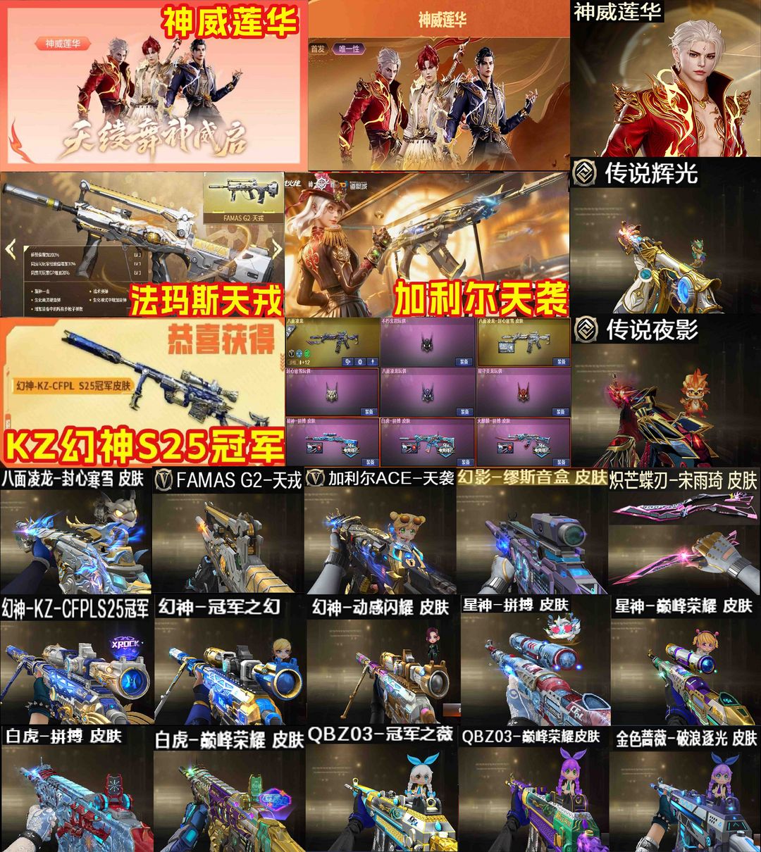 【装备道具】: 神威莲华/传说辉光/传说夜影★幻神-动感闪耀/幻神-冠军之幻/幻神-KZ-CFPLS25冠军/星神-拼搏/星神-巅峰荣耀/裁决-流光秘银/幻影-缪斯音盒/白虎-巅峰荣耀/白虎-拼搏/QBZ03-冠军之薇/QBZ03-巅峰荣耀/金色蔷薇-破浪逐光/雷神-杨戬/黑骑士-冠军之势/黑龙-冠军之武/黑龙-墨子/黑龙-能量核心/火麒麟-华夏之心/火麒麟-轻羽/炽芒蝶刃-宋雨琦/炽芒蝶刃-冠军炽芒/屠龙-荣耀之锋/屠龙-星耀*2/火麒麟-拼搏/裁决-过载/毁灭-Heartshot★M200-竞技荣光/VSK-94-金蚀/G36C-幻影/ScarLight-白虎/白虎-电玩蓝兔/QBZ03-独角-II/八面凌龙/柯尔特-冠军之特/柯尔特-竞技荣光*2/COP357-云龙/炽芒蝶刃/Knife-冠军之刃/加利尔ACE-天袭/FAMASG2-天戎★星神音效卡/幻神音效卡/白虎音效卡/裁决音效卡/金色蔷薇音效卡/黑龙音效卡/朱雀-电竞之星音效卡★竞技荣光套装/云龙套装/电竞教官-云悠悠/华/雨墨/关小雨/宋雨琦/王者风神-觉醒版/王者白虎/王者芳薇/COP-雷霆王者/USP雷暴王者