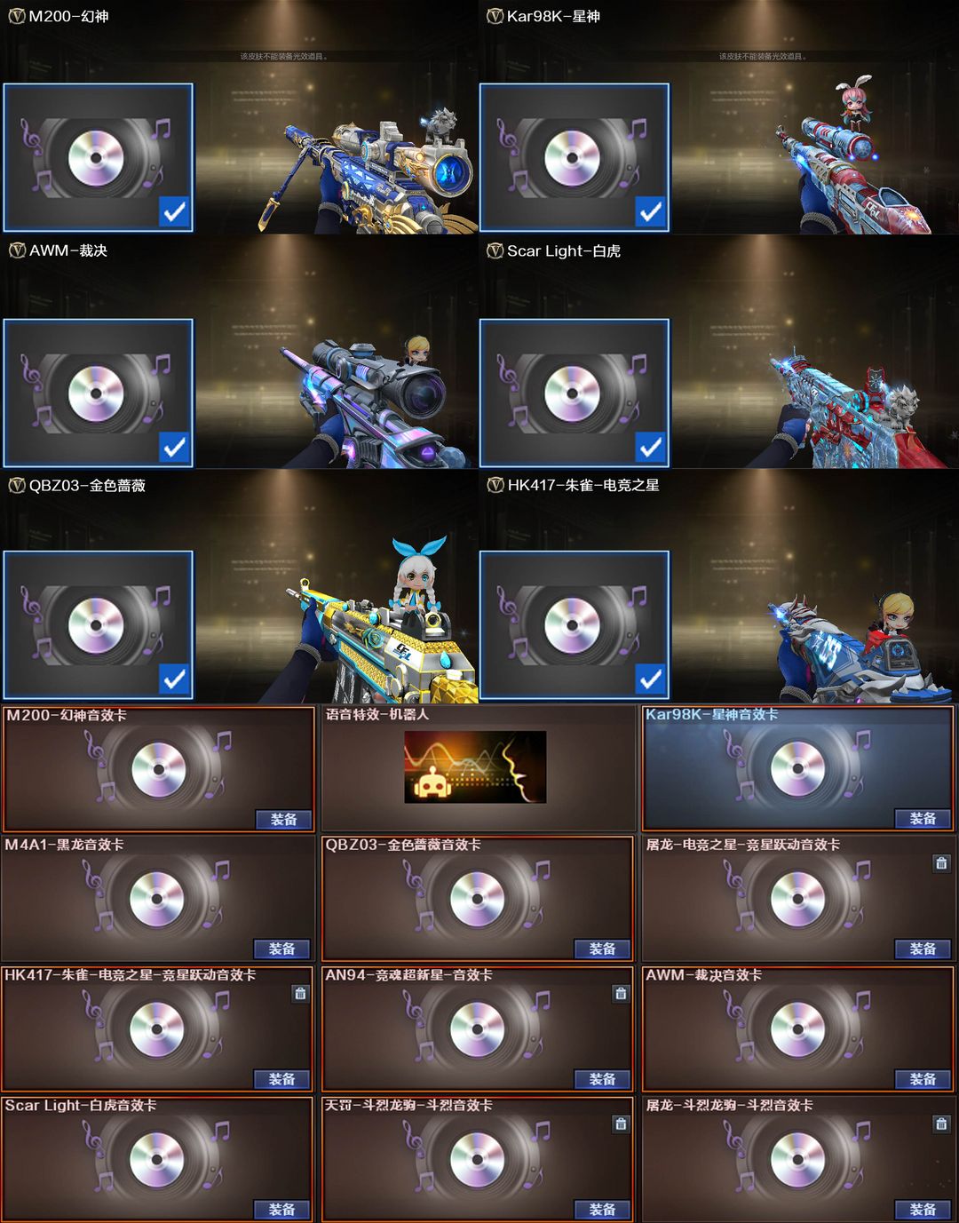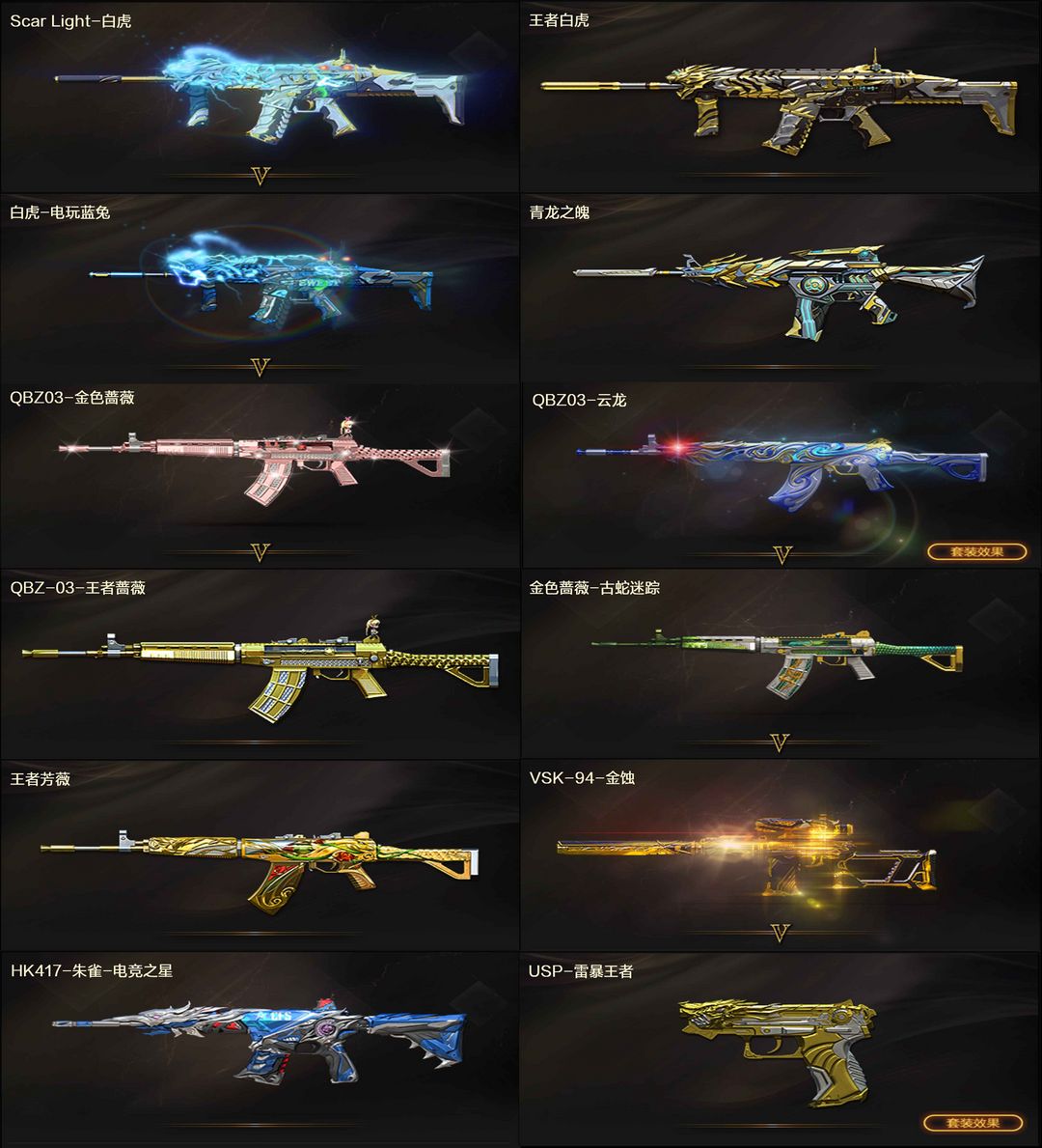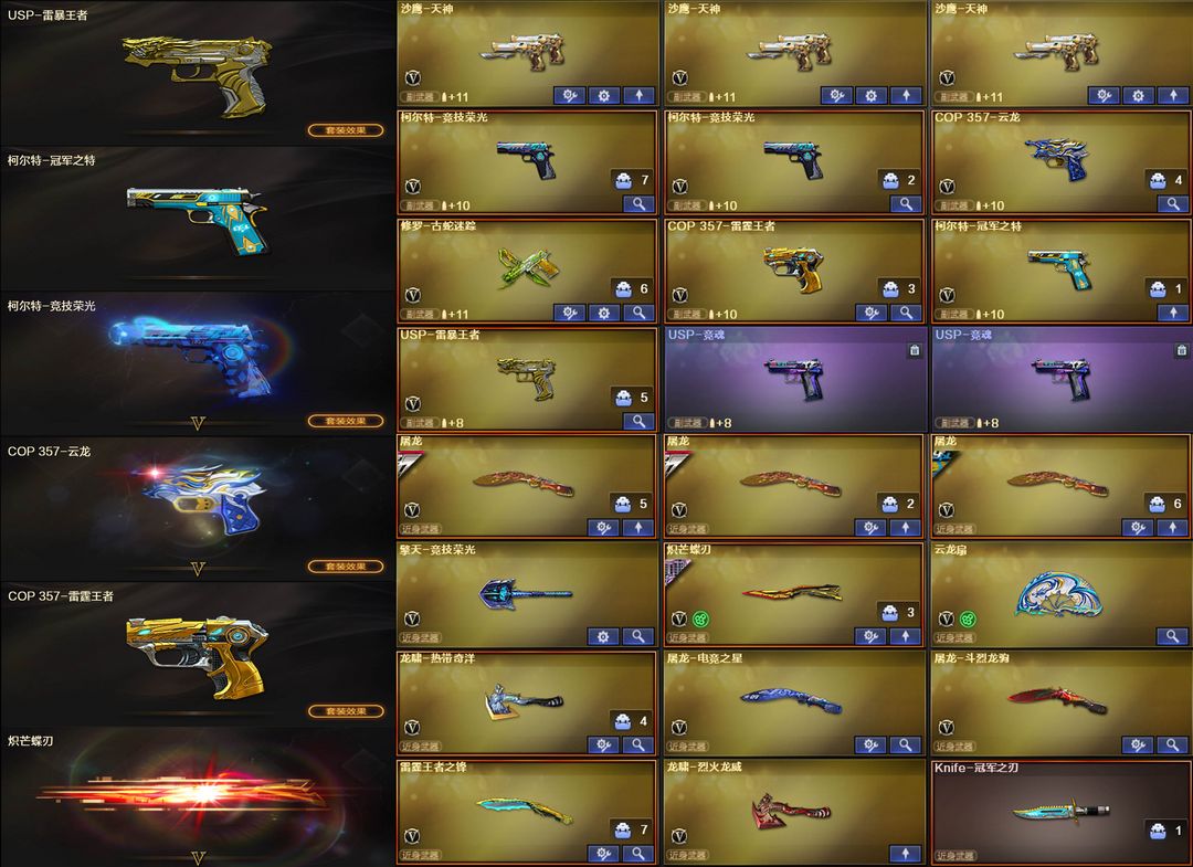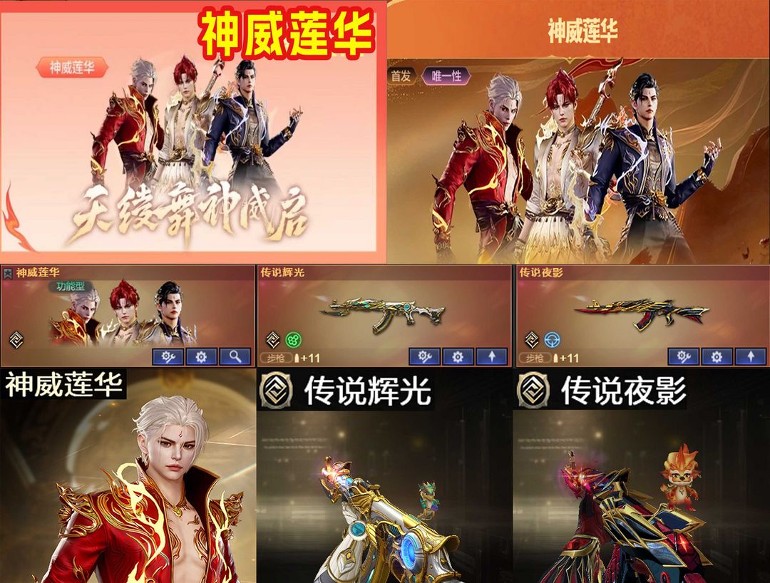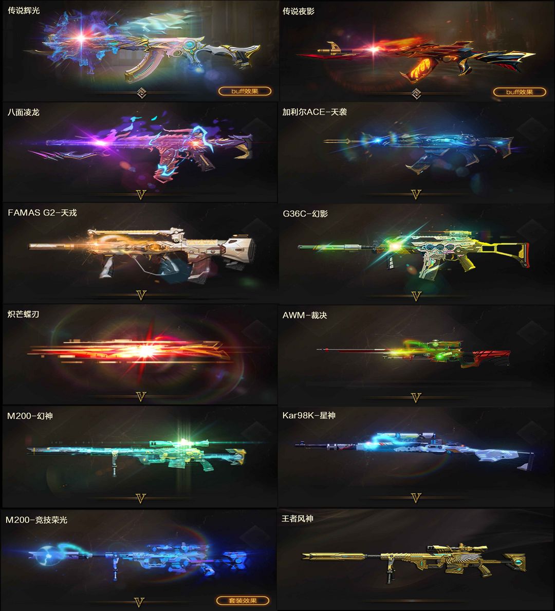 【装备道具】: 神威莲华/传说辉光/传说夜影★幻神-动感闪耀/幻神-冠军之幻/幻神-KZ-CFPLS25冠军/星神-拼搏/星神-巅峰荣耀/裁决-流光秘银/幻影-缪斯音盒/白虎-巅峰荣耀/白虎-拼搏/QBZ03-冠军之薇/QBZ03-巅峰荣耀/金色蔷薇-破浪逐光/雷神-杨戬/黑骑士-冠军之势/黑龙-冠军之武/黑龙-墨子/黑龙-能量核心/火麒麟-华夏之心/火麒麟-轻羽/炽芒蝶刃-宋雨琦/炽芒蝶刃-冠军炽芒/屠龙-荣耀之锋/屠龙-星耀*2/火麒麟-拼搏/裁决-过载/毁灭-Heartshot★M200-竞技荣光/VSK-94-金蚀/G36C-幻影/ScarLight-白虎/白虎-电玩蓝兔/QBZ03-独角-II/八面凌龙/柯尔特-冠军之特/柯尔特-竞技荣光*2/COP357-云龙/炽芒蝶刃/Knife-冠军之刃/加利尔ACE-天袭/FAMASG2-天戎★星神音效卡/幻神音效卡/白虎音效卡/裁决音效卡/金色蔷薇音效卡/黑龙音效卡/朱雀-电竞之星音效卡★竞技荣光套装/云龙套装/电竞教官-云悠悠/华/雨墨/关小雨/宋雨琦/王者风神-觉醒版/王者白虎/王者芳薇/COP-雷霆王者/USP雷暴王者