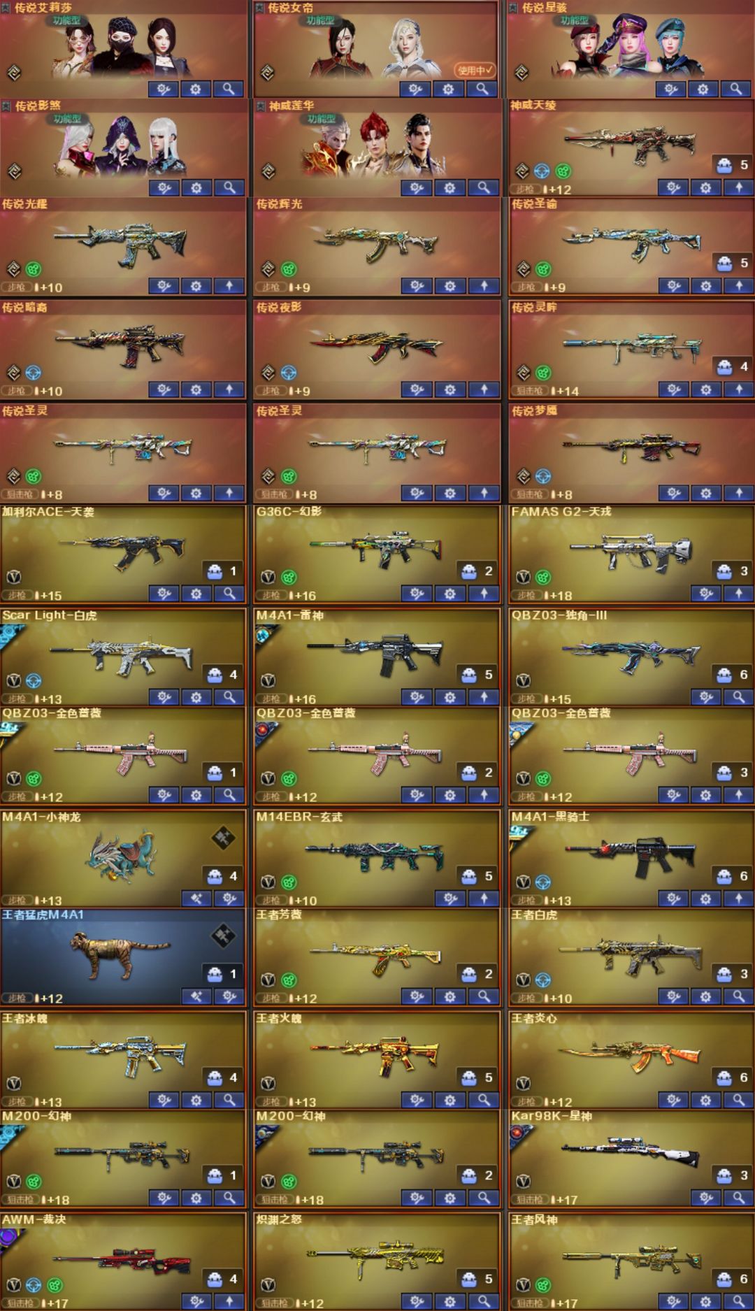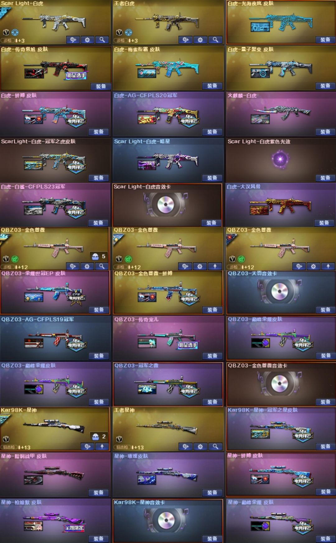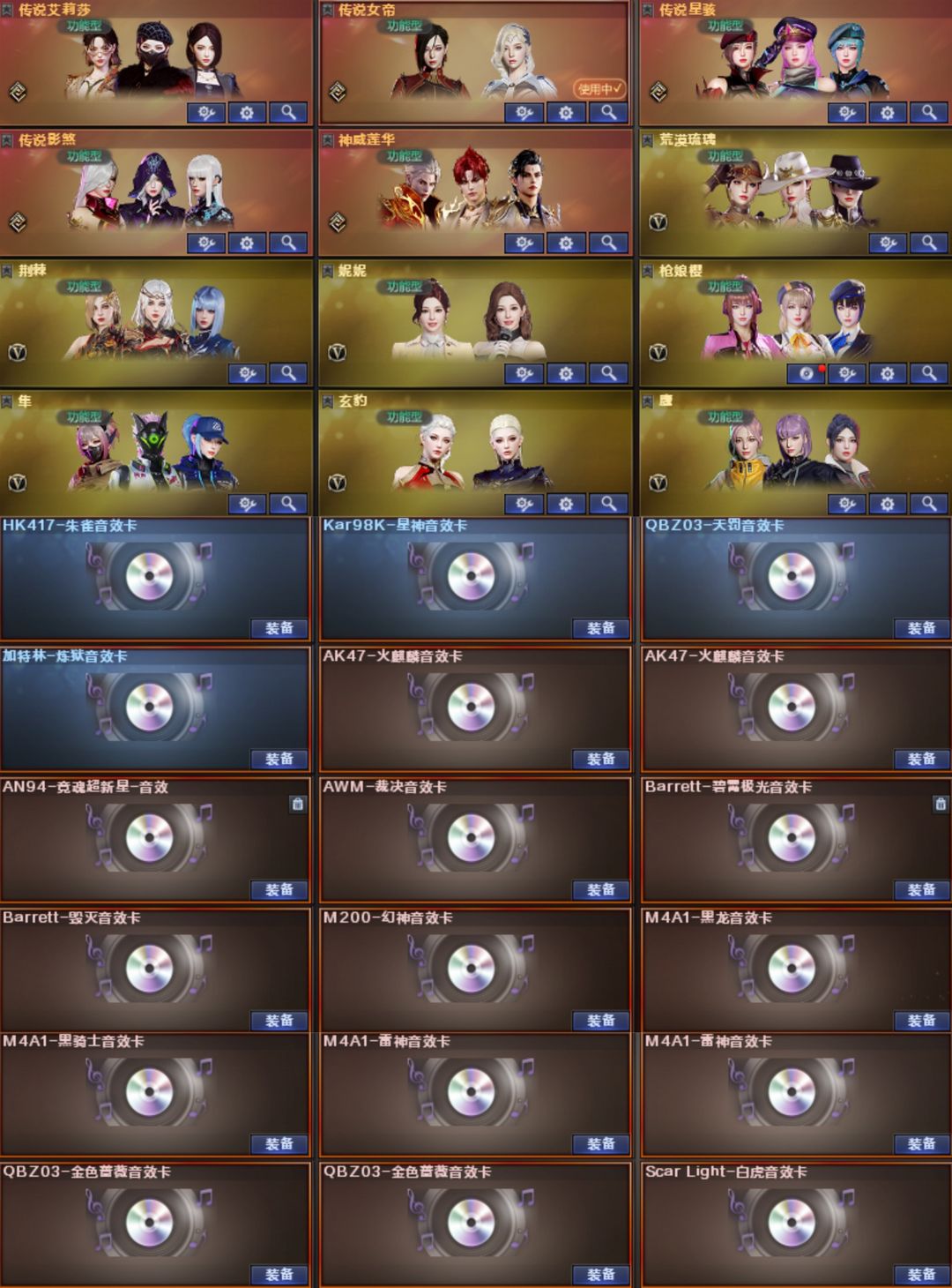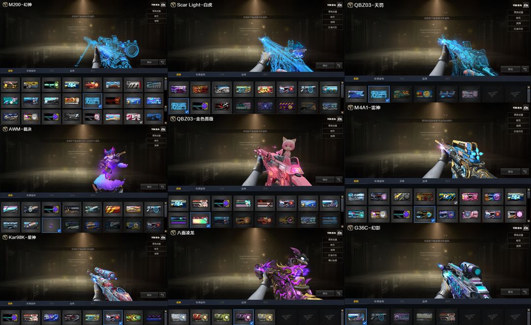 双神威,白虎-光海夜岚,加利尔,EP全套,女帝,星骇,艾丽莎,影煞,圣谕,灵眸,光耀,暗裔,辉光,圣灵,梦魇,破晓,天戎,幻影,幻神+音效卡+汪汪小队+权+YZK+电竞之星+光海夜岚+宠儿+KZ+EP+新AG+白鲨2023+星火小队+欧欧+冠军之幻+白鲨+周瑜+AG+巅峰荣耀+丹凤+星耀+青鹤+动感+纸灯笼+电流骇客,裁决+音效卡+紫罗兰+巅峰荣耀+流光秘银+胡桃+叶芒苍灵+羽挚,白虎+光海+常旭+音效卡+冠军+白鲨+AG+拼搏+梅雀+量子+暗星+大汉,QBZ+音效卡+喵喵+EP+拼搏+传奇宠儿+冠军之薇+AG+巅峰荣耀+枪娘阿敏,玄武,星神+音效卡+拼搏+巅峰荣耀+枪娘默+璀璨,王者白虎,王者芳薇,雷神十周年+音效卡,王者雷怒,EP特*2,冥王,USP-雷暴王者x2,白鲨特3把,USP-雷暴,cop7把,冠特,荣耀特2把,,USP-神工天巧,黄金鲨臂,冠军之刃,6烈+蝴蝶+蛇影双娇+毒蜂,6盘+玄幻-宇宙万象+炼狱3皮带卡,MAC