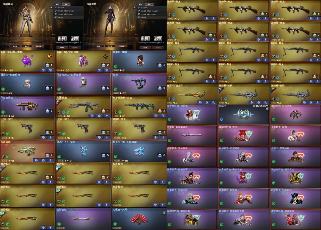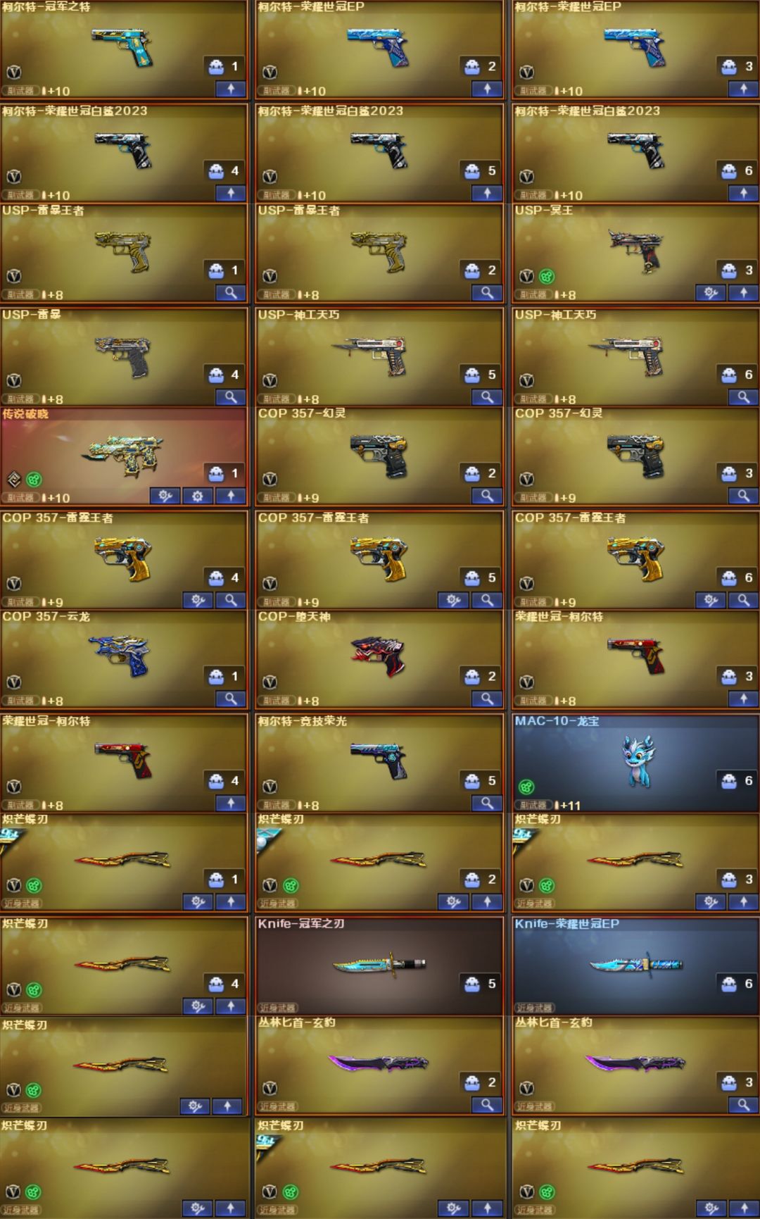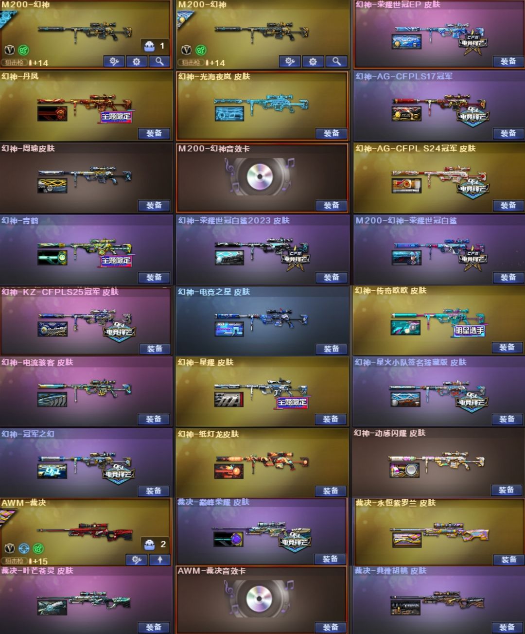 双神威,白虎-光海夜岚,加利尔,EP全套,女帝,星骇,艾丽莎,影煞,圣谕,灵眸,光耀,暗裔,辉光,圣灵,梦魇,破晓,天戎,幻影,幻神+音效卡+汪汪小队+权+YZK+电竞之星+光海夜岚+宠儿+KZ+EP+新AG+白鲨2023+星火小队+欧欧+冠军之幻+白鲨+周瑜+AG+巅峰荣耀+丹凤+星耀+青鹤+动感+纸灯笼+电流骇客,裁决+音效卡+紫罗兰+巅峰荣耀+流光秘银+胡桃+叶芒苍灵+羽挚,白虎+光海+常旭+音效卡+冠军+白鲨+AG+拼搏+梅雀+量子+暗星+大汉,QBZ+音效卡+喵喵+EP+拼搏+传奇宠儿+冠军之薇+AG+巅峰荣耀+枪娘阿敏,玄武,星神+音效卡+拼搏+巅峰荣耀+枪娘默+璀璨,王者白虎,王者芳薇,雷神十周年+音效卡,王者雷怒,EP特*2,冥王,USP-雷暴王者x2,白鲨特3把,USP-雷暴,cop7把,冠特,荣耀特2把,,USP-神工天巧,黄金鲨臂,冠军之刃,6烈+蝴蝶+蛇影双娇+毒蜂,6盘+玄幻-宇宙万象+炼狱3皮带卡,MAC